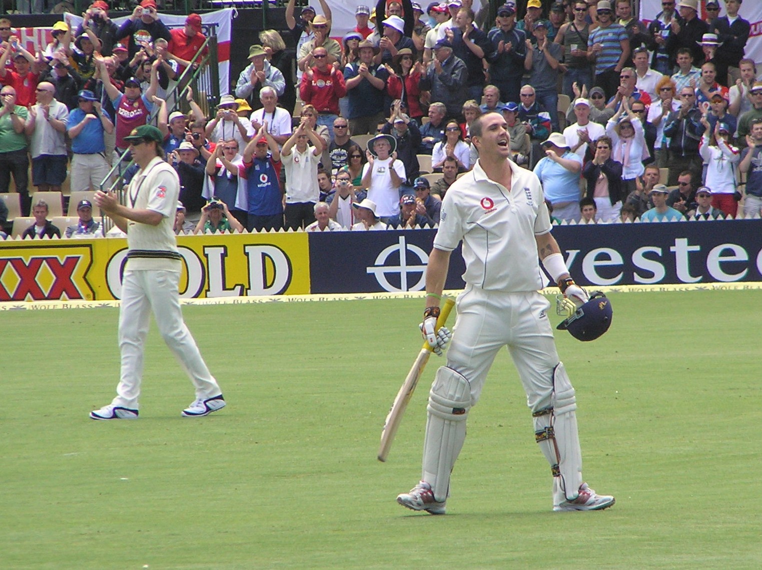 So, proceedings resumed at 266 for 3. Kevin Pietersen on 60, Paul Collingwood on 98. KP would face the first ball of the day, the weather was set fair again, the other lads had seats near the Don Bradman Stand to the south of the ground, while Sir Peter joined me an Matt in the Members and we’d secured an additional pass for the day. Saturday at Adelaide in 2002 had been a scorching little affair, with it over 40 degrees. It wasn’t quite that blazing that day.