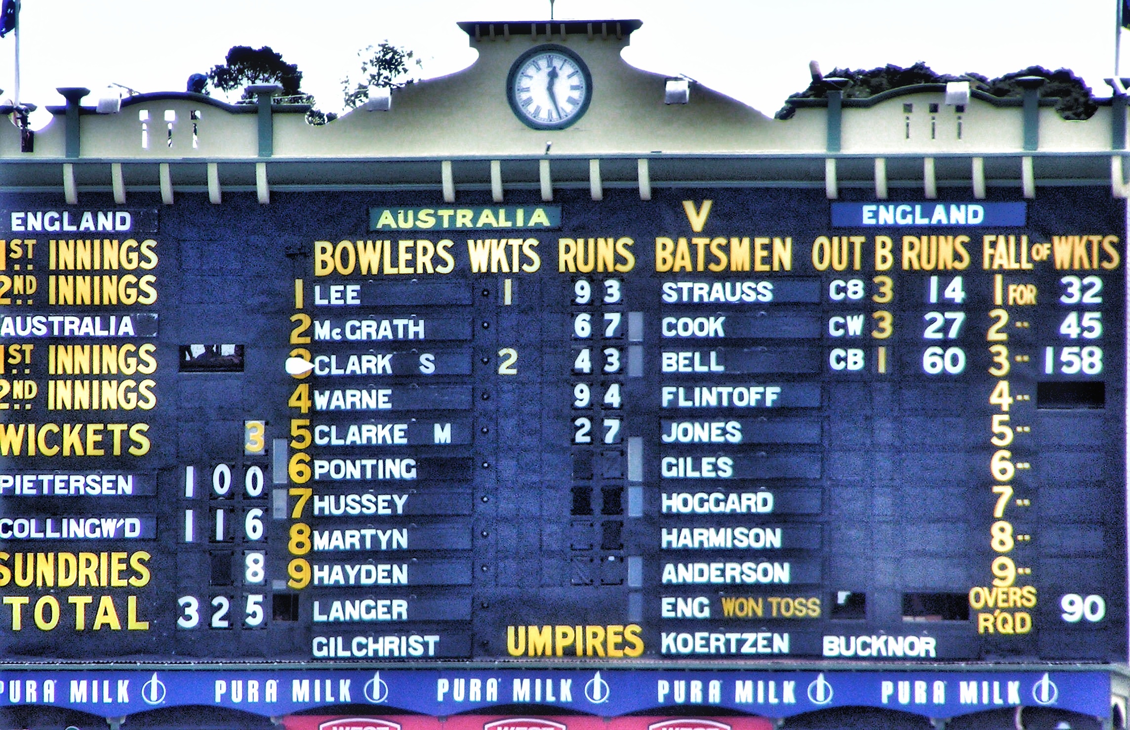 Collingwood settled down after his hundred with a four, and it took a few overs for KP to get his total moving with a 3 off Brett Lee. This had followed a “controversial moment” two balls before. Brett Lee beat KP and there was a large appeal for caught behind. Not Out was the verdict from Steve Bucknor. A little while later the replays showed there was a hot spot. No reviews in those days. It was a gentler time!!!