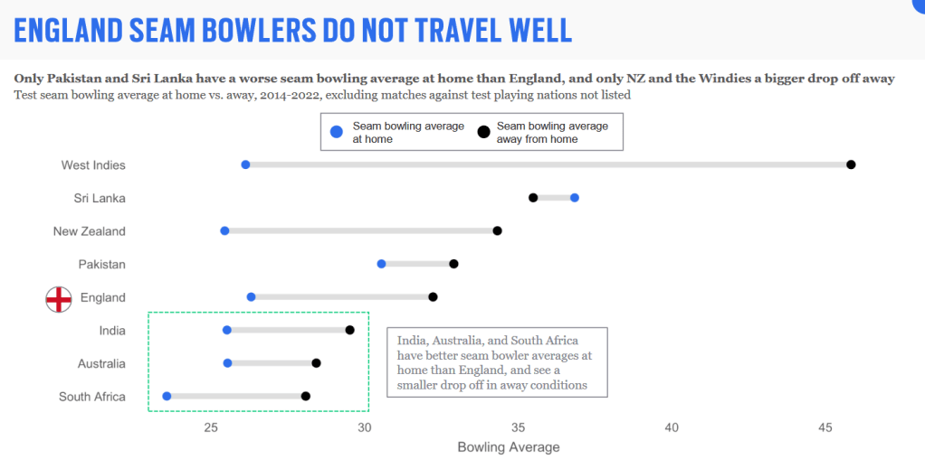Now look at just the location of the black dots. According to this graph (and confirmed by a quick check on Statsguru), England have the fourth-best seam unit away from home. They travel better than New Zealand or Pakistan, for example, who both have the reputation of being very good pace attacks. If this graph was presented without comment, what would someone take from it?