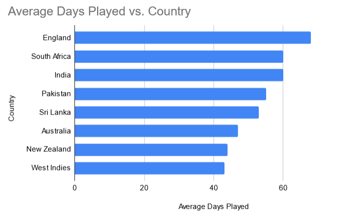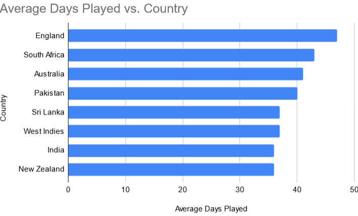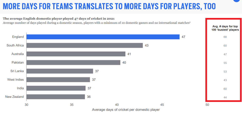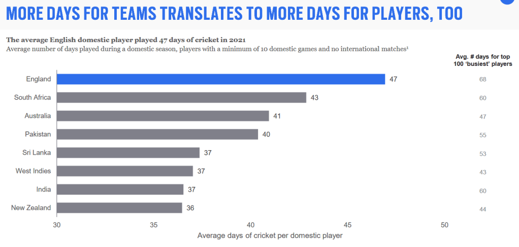 Seen at this scale, the differences between countries seem far less pronounced. English players play 30% more days than those from India or New Zealand according to this data, or 10% more than in South Africa. It suddenly becomes a less obvious factor for why English players might underperform.