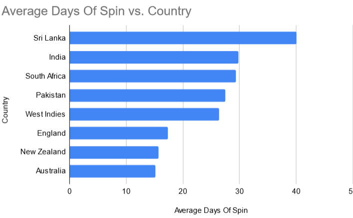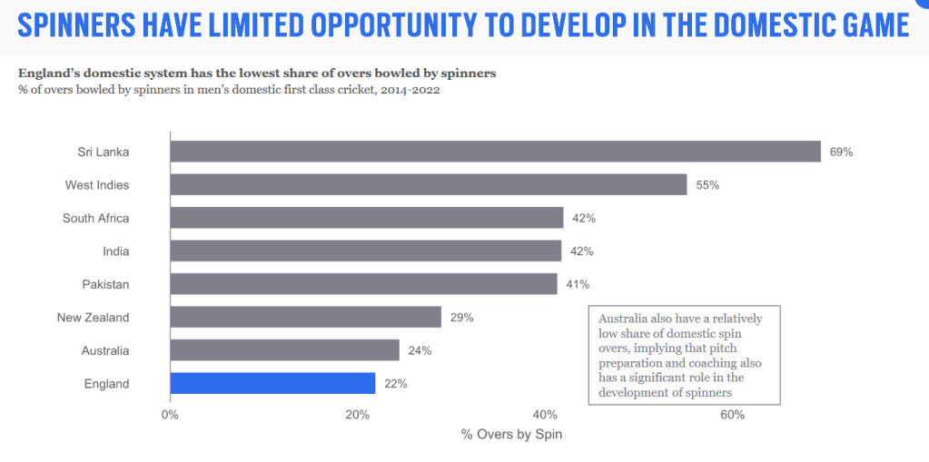 On the face of it, this looks terrible. Spinners get fewer domestic opportunities in England than the other 8 cricket boards, so how can the England team be expected to develop spinners who can prosper in Asia? Except that this isn’t what this chart actually shows. Instead of (for example) total spin overs bowled, it is a percentage of total overs. To answer why the panel chose this specific measure to illustrate their point, consider this chart:
