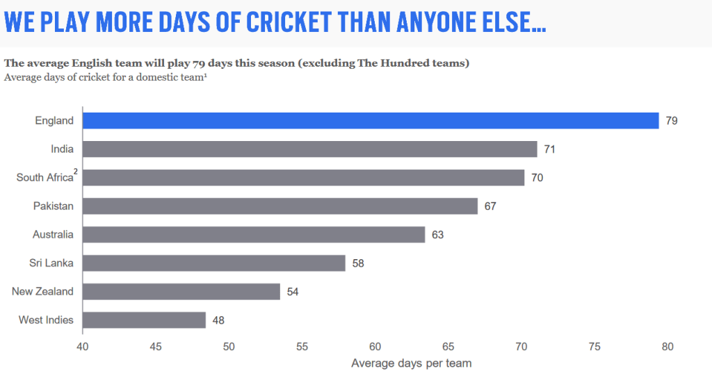 There are three massive elephants in the room which the report has totally ignored. One is The Hundred. It is hand-waved through with the rather optimistic description of “The Hundred is committed through to 2028, and is a clear best vs. best competition”. How they square “best vs best” with the existence of Welsh Fire as a team is frankly beyond me. The Hundred apparently exists as a giant monolith in the middle of the English season, around which everything else has to fit. The cricket calendar in 2019 was far from perfect, but even the tournament’s biggest fans can’t deny that the domestic schedule is even worse now. The Hundred does aid the development of English cricketers, but almost exclusively towards entering other T20 leagues around the world rather than playing for England.
